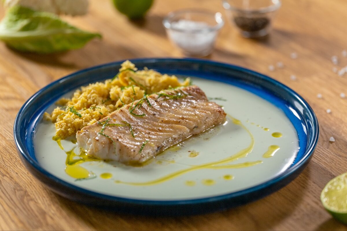 Ужин — тот самый прием пищи, который должен быть особенным 😍 Если любимые блюда немного наскучили, а интересных идей нет — то пришло время для нового рецепта. Делимся пошаговым приготовлением трески с йогуртовым соусом и пастой из цветной капусты. Получается очень сочно и вкусно! Ингредиенты: Приготовление: ШАГ 1/5 Начинаем с соуса. В его основе — питьевой йогурт. Мы рекомендуем выбирать “Solo” Матча — Мята — Лимон. Он придаст особую свежесть и изюминку блюду. Смешиваем йогурт с соком лайма, щепоткой соли и соевым соусом. ШАГ 2/5 Цветную капусту натираем на мелкой терке. Чем мельче по размеру получатся кусочки, тем более нежным будет соус. ШАГ 3/5 Выливаем на сковороду оливковое масло, соль, перец и соевый соус. Выкладываем на смесь спинку трески и ставим на средний огонь. Каждую сторону обжариваем около 3-4 минут. Убираем треску, очищаем и высушиваем сковороду. ШАГ 4/5 Обжариваем карри в оливковом масле с добавлением воды. Немного держим соус, а затем добавляем натертую цветную капус