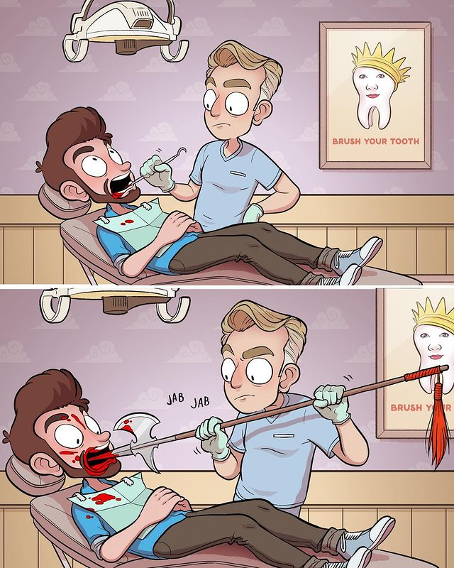 Художник из Лос-Анджелеса делится угарными странностями, типичными американским парням: какой ужас парни представляют на приёме у стоматолога; почему парни едят хлопья, которые ненавидят; почему парни фанатично относятся к шарфам; почему парни не могут просто так снять куртку в жаркий день. Ребята, спасибо за активность, проявленную на предыдущей статье про опровержение мифов об идеальной жизни интровертов. Теперь тащим эту статью в тренды! Ставим лайк, пишем комментарий и подписываемся, чтобы не пропускать самые смешные подборки комиксов. Очень скоро будет эксклюзив специально для подписчиков канала Goga. А сейчас... давайте смеяться с американского юмора :-) 😲 1. Тот самый страшный момент, когда стоматолог пытается вылечить труднодоступный зуб 🌞 2. Парни слишком нарядные, чтобы просто взять и снять куртку в жаркий день 🥣 3. Так вот почему парни едят хлопья, которые ненавидят 👕 4. Минуточку, подождите секунду 📦 5. Американские парни достаточно нетерпеливы 🥧 6. Самая сложная амер