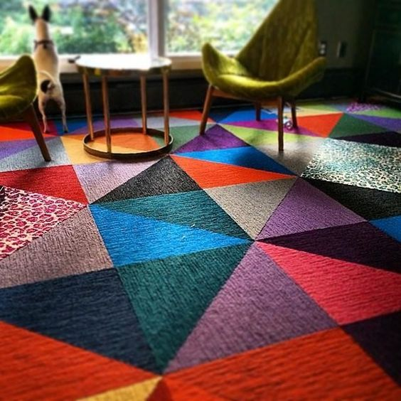 Отличная идея - преобразить скучный пол с помощью остатков ковролина, в яркую мозаику. Идеи декора.