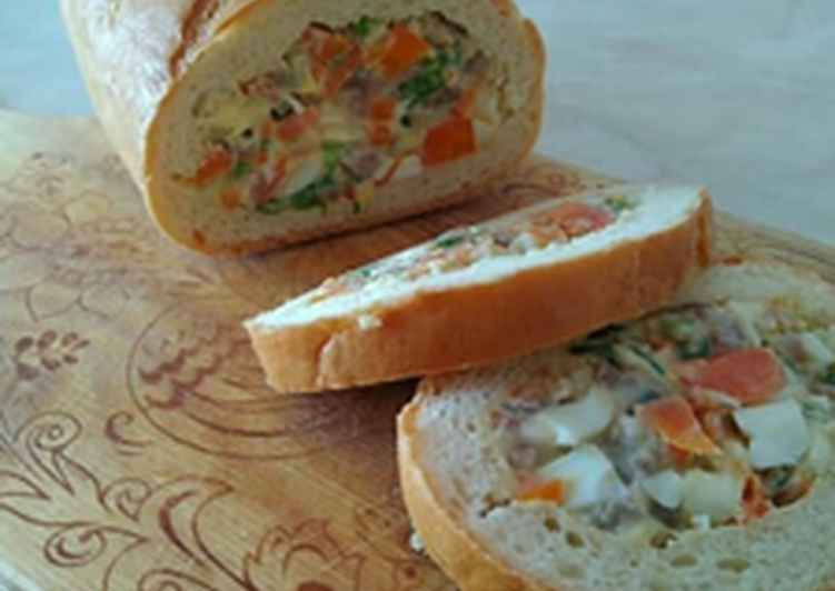 Фаршированный батон с селёдкой и овощами Ингредиенты: Яйца 2 штуки Зелёный лук 30 г. Укроп 30 г. Соль Батон 1 штука Морковь 1 штука Масло сливочное 200 г. Селедка филе 1 штука С одной стороны батона отрезаем "попку" и откладываем ее в сторону. Теперь нам нужно вынуть мякиш по всей длине батона. Для этого берем небольшой нож. Таким ножом удобнее всего вынимать мякиш. Понемногу начинаем вырезать мякиш, отступая на приблизительно одинаковое расстояние от корочки. Вынимаем мякиш в отдельную емкость. Теперь опять вырезаем глубже мякиш. Если вдруг вы случайно прорежете корочку батона - ничего страшного не произойдет, но старайтесь этого не делать. Чем дальше вы будете углубляться в батон, тем длиннее нож нужно использовать. Смотрите, вот такой "чистенький" батон получился внутри. "Попку", которую мы отрезали, тоже можно "очистить" от мякоти. Отставляем нашу заготовку в сторону. Весь вычищенный мякиш нужно измельчить в крошку. Я делаю это руками. Сливочное масло нужно растопить, зелень и лук