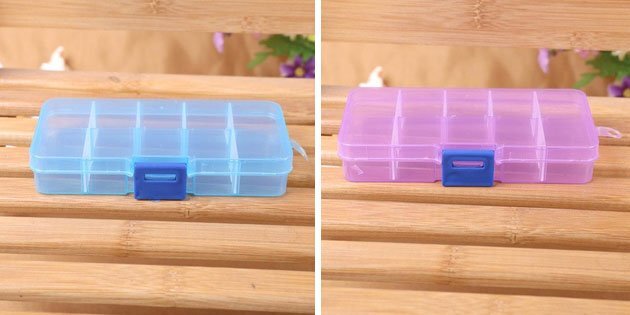 Пуговицы, канцелярские скрепки, серьги, невидимки, болты и гайки — в доме масса мелких вещей, которые вечно теряются. Упорядочить их поможет вот такой контейнер с ячейками. Его длина — 13 см, ширина — 6,5 см, высота — 2 см. Цена: от 134 рублей.