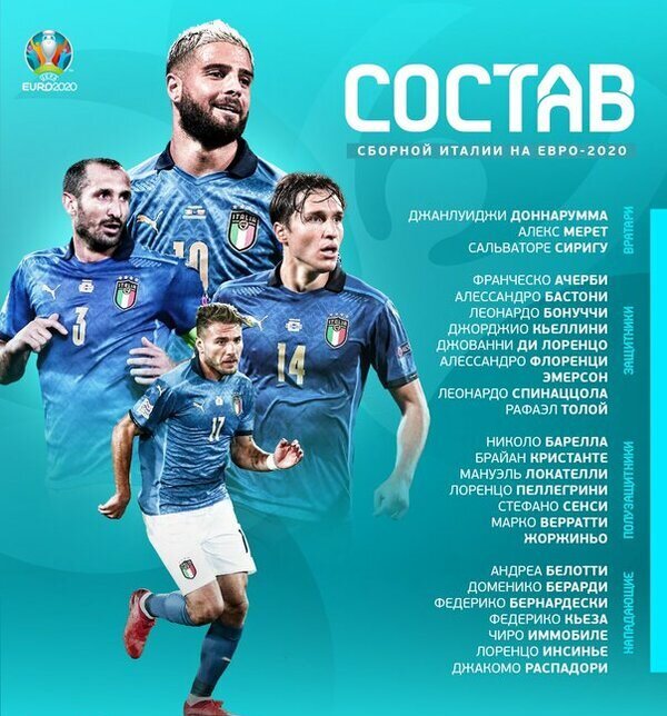 Вратари: Джанлуиджи Доннарумма ("Милан"), Алекс Мерет ("Наполи"), Сальваторе Сиригу ("Торино") Защитники: Франческо Ачерби ("Лацио"), Алессандро Бастони ("Интер"), Леонардо Бонуччи ("Ювентус"), Джорджио Кьеллини ("Ювентус"), Джованни Ди Лоренцо ("Наполи"), Эмерсон ("Челси"), Алессандро Флоренци ("ПСЖ"), Леонардо Спинаццола ("Рома"), Рафаэл Толой ("Аталанта") Полузащитники: Николо Барелла ("Интер"), Брайан Кристанте ("Рома"), Жоржиньо ("Челси"), Мануэль Локателли ("Сассуоло"), Лоренцо Пеллегрини ("Рома"), Стефано Сенси ("Интер"), Марко Верратти ("ПСЖ"), Федерико Бернардески ("Ювентус"), Федерико Кьеза ("Ювентус") Нападающие: Андреа Белотти ("Торино"), Доменико Берарди ("Сассуоло"), Чиро Иммобиле ("Лацио"), Лоренцо Инсинье ("Наполи"), Джакомо Распадори ("Сассуоло") Главный тренер: Роберто Манчини Сборная Италии стала одной из двух команд отборочной кампании, сумевших записать в свой актив максимальный результат. В одном ряду с Бельгией итальянцы не просто выиграли свою группу, а и взяли