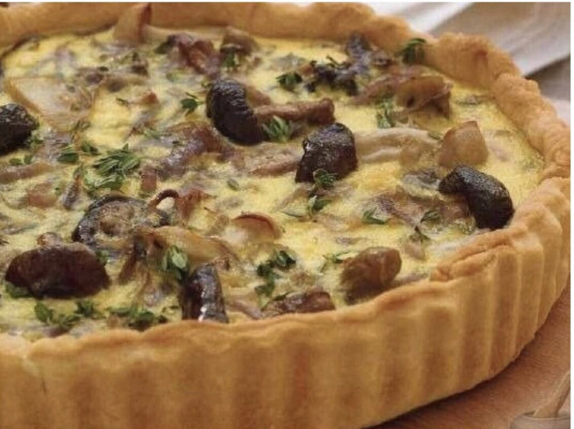 на 100 грамм 86.28 Ккал Б/Ж/У : 7.03/5.07/3.3 Ингредиенты : Овсяные отруби 4 ст. ложки(смолоть в муку) Яйца 2 шт Разрыхлитель 1 ч. ложка Вода 2 ст. ложки Соль 3 гр Начинка: Шампиньоны 350 гр Лук 1 шт Оливковое масло 2 ч. ложки Соль, перец по вкусу Заливка: Натуральный йогурт 4 ст. ложки Яйцо 1 шт Молоко 1% 1 ст. ложка Сыр 50 гр ( натереть на крупной терке) Чеснок 5 гр Соль по вкусу Желтки отделяем от белков. Желтки, отруби, разрыхлитель, воду и соль тщательно перемешиваем. Взбиваем белки. Соединяем белки с полученной ранее смесью и аккуратно перемешиваем снизу вверх, стараясь, чтобы белки не опали. Выкладываем в форму и ставим выпекать до готовности в заранее разогретую духовку. (Примерно 20-25 мин. при 180 градусах) Пока печётся корж , готовим начинку : Режем лук кубиками и обжариваем на сковороде. Добавляем грибы и тушим до испарения жидкости. Солим, перчим. Для заливки смешиваем все компоненты и примерно половину натертого сыра. По консистенции заливка должна пол