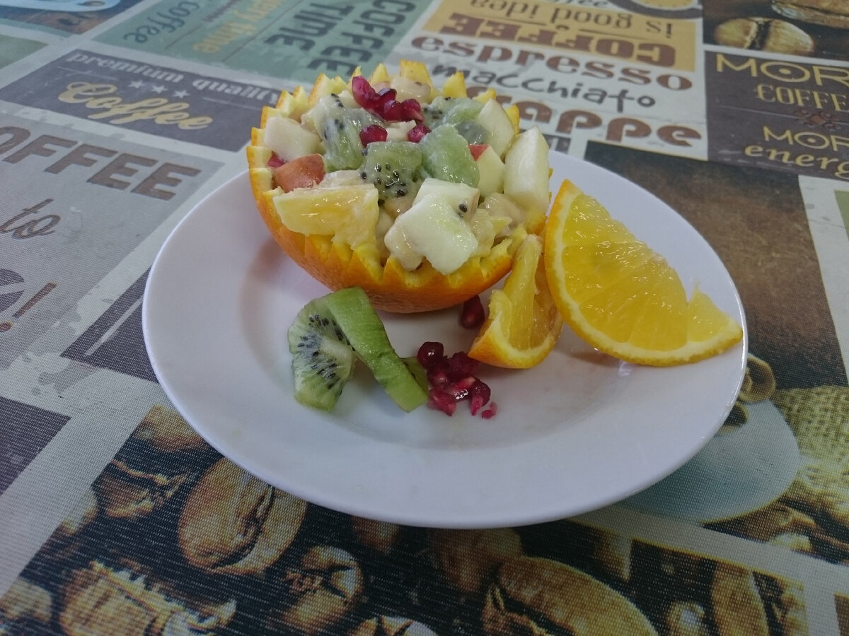 Очень вкусный а главное простой фруктовый салат , очень подходящий на летний сезон. Летом тяжелую пищу есть не очень хочется а фруктовый салат подойдет как нельзя кстати. Фрукты можно использовать любые, какие вам душе угодны, но по моему мнение фрукты которые использовал я, имеют более хорошую сочетанию вкусов. Время приготовления 10 минут . Ингредиенты: на 1 порцию Не обязательно класть все по граммам, если вам нравится бананы кладите больше бананов , нравятся яблоки кладите больше яблок. Аналогию поняли) Киви я не стал вносить в список ингредиентов, тут смотрите по вкусам, я лично использовал киви как украшение потом уже решил добавить в салат. Техника приготовления и рекомендации: 5. Посыпаем зернами граната ( по желанию ) Примечания: Салат очень простой но спокойно порадует ваши вкусовые рецепторы, такой салат хорошо есть на завтрак или тем кто на диете. На сегодня все! Приятного аппетита!