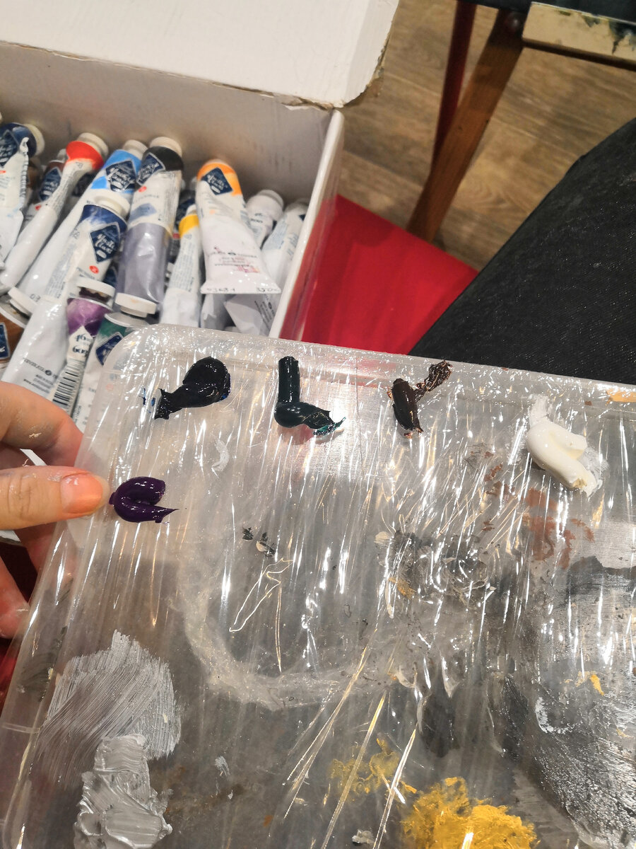 Делюсь секретом палитры, которая будет жить вечно Для этого потребуется любая поверхность белого или прозрачного цвета Я использую прозрачную крышку от органайзера Дальше нам потребуется пищевая пленка, которой мы обмотаем нашу будущую поверхность. Теперь на крышку распределяем нужные цвета масляных красок и можно приступить к работе Если на палитре у вас осталось много краски и вы не хотите, чтобы она высохла и испортилась, то сверху можно еще раз обмотать пленкой и краска не застынет до вашего следующего раза, когда захотите вновь порисовать Полезен ли вам был этот секрет? Хотели бы чаще видеть подобные рубрики?