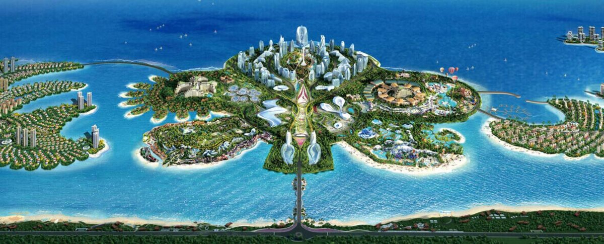 Ocean Flower Island – новое туристическое место в Китае, строительство которого обошлось в 24 млрд долларов и велось в течение 8 лет… Слоганом необычного масштабного проекта, сверху похожего на диковинный цветок, китайские создатели выбрали фразу «А cultural destination appealing to the global tourists» – культурное направление, привлекательное для туристов со всего мира. Туристический архипелаг состоит из трёх искусственных островов общей площадью 4 кв. км, объединённых между собой. На них расположены объекты для развлечения и отдыха для людей всех возрастов и интересов. Отели, в том числе категории 5 звёзд, парки и аквапарки, музеи, океанариум, магазины duty free, конференц-центр, ТЦ, кафе, бары, рестораны, достопримечательности. Острова разбиты на улицы, а все объекты подсвечены необычной современной системой, которая сама по себе может быть достопримечательностью. Реализовала проект китайская компания Evergrande Group на деньги частных инвесторов, без участия государства