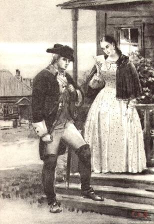 Со временем Гринев нашел в Марье Ивановне «благоразумную и чувствительную девушку». Петр Андреич начал писать стихи и как-то прочел одно из своих произведений, посвященное Маше, Швабрину. Тот раскритиковал стихи и сказал, что девушка вместо «нежных стишков» предпочла бы «пару серег». Гринев обозвал Швабрина мерзавцем, и тот вызвал Петра Андреича на поединок. Первый раз им не удалось сойтись – их заметили и отвели к коменданту. Вечером Гринев узнал, что Швабрин в прошлом году сватался к Маше и получил отказ.На следующий день Гринев и Швабрин снова сошлись в поединке. Во время дуэли Петра Андреича окликнул подбежавший Савельич. Гринев оглянулся, и противник нанес ему удар «в грудь пониже правого плеча».