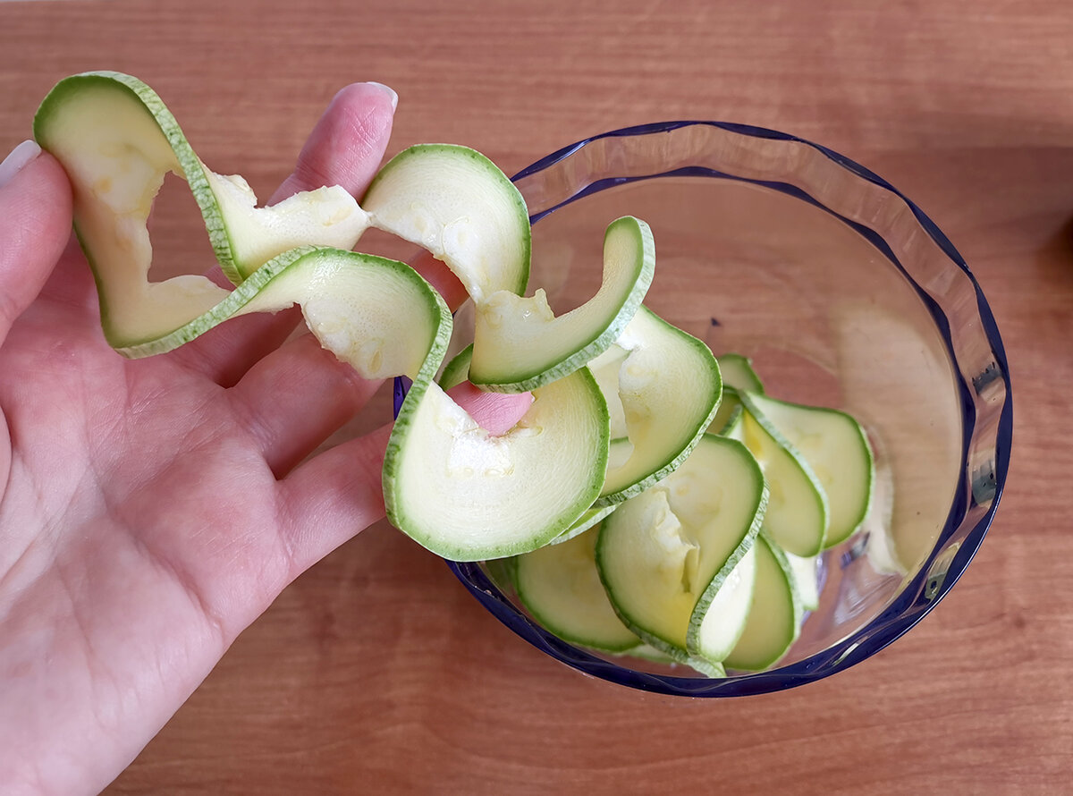 Это был правильный выбор: из мягкого и эластичного кабачка получаются очень красивые ленты. Такие можно запечь в омлете или пироге, украсить ими овощное рагу или мясное блюдо.