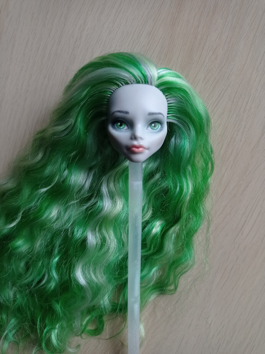 Всем привет! Меня зовут Александра, и я увлекаюсь преображением (ООАКом) кукол Monster High и Ever After High. Я продолжаю работу по переделке Гулии Монстер Хай в лесную дриаду-стрекозу. У меня уже готова голова куколки: прошиты волосы и расписано лицо. Верхние ресницы буду приклеивать в самый последний момент. Теперь пришла пора заняться её нарядом. Платье делала на корсаже. Заготовку для корсажа, как обычно, сделала из высушеной салфетки и клея ПВА. У меня была сложная задача - сделать резной вырез. Ткань приклеивала к корсажу с помощью клеевой паутинки. Сделала юбку из белого шелка, поверх юбки нежные листочки из зеленой ткани, которой обтягивала корсаж. Корсаж и листочки расписала акрилом. Дополнительным украшением платья будут хрустальные листочки, которые будут крепиться снизу на корсаже. Для изготовления листочков взяла прозрачный термопластик. Нагрела его и придала листочки нужную форму. И покрасила их краской для витража. Листочки получились прозрачные, очень нежны
