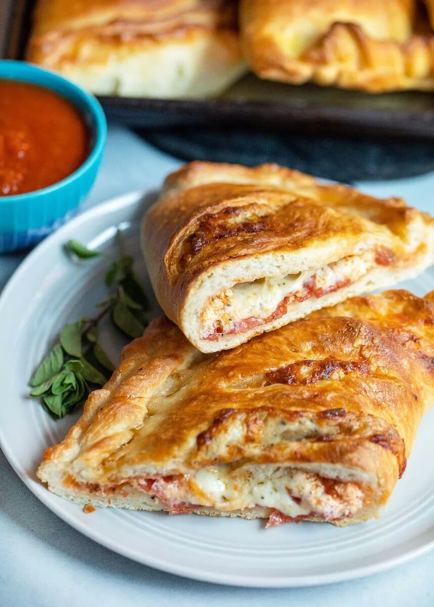Подавайте кальцоне в теплом виде с дополнительным соусом для обмакивания.