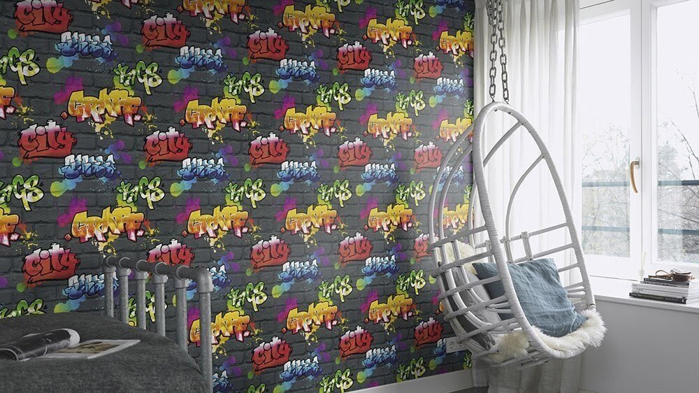 Кирпичная стена может быть изрисована граффити, это придаст помещению яркости. Такие обои лучше использовать как акцент, сочетая их с другими вариантами обоев под кирпич, или другими компаньонами. Даже небольшой фрагмент стены, оклееный таким узором, украсит комнату.