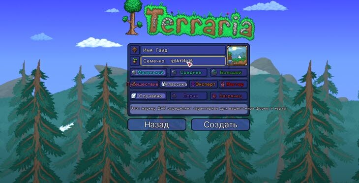 В этом меню вы должны выбрать себе имя, а также выбрать режим, в котором будете играть. Изначально мы рекомендуем вам играть именно на классике. Путешествие – это что-то вроде креативного мода в Minecraft, по крайней мере, по своей сути. Что касается среднего и сложного режима, то Terraria – это не та игра, в которой новичку нужно начинать с этих уровней, ибо буквально 1-2 ошибок, и вы можете испортить себе прохождение.