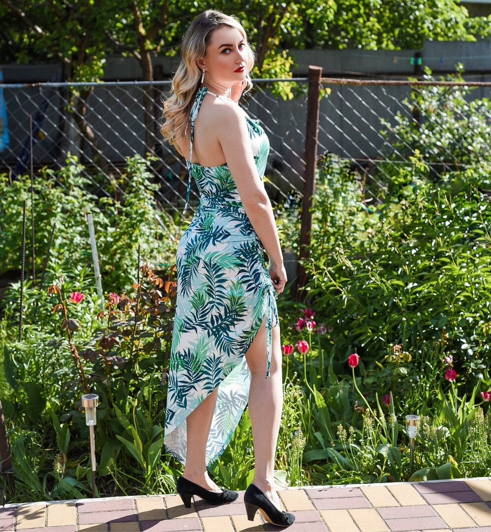 Летнее пляжное асимметричное платье с принтом в виде тропических листьев. Заказывала в магазине NewAsia Garden Official Store на AliExpress. Мне понравился дизайн с регулируемой шнуровкой с одной стороны. По ссылке в наличии 4 расцветки. Доставка длилась чуть больше недели. Упаковка: почтовый пакет, прозрачный пакет. На параметры 84/64/92, рост 165 см заказывала платье в размере S, но можно было взять и XS, так как в талии немного свободновато. Внимание: этот пост содержит рекламные ссылки (если их можно таковыми назвать). Вещь куплена мной на AliExpress, все фото мои, мнение о товаре тоже моё. Прямая ссылка на товар на AliExpress: https://s.click.aliexpress.com/e/_9AGKXf Бирок не было, но присутствовал ярлычок. Материал: полиэстер, эластан. Ткань достаточно тонкая, не просвечивает, эластичная, гладкая, приятная к телу. В груди есть подкладка. Платье завязывается на завязки сзади в районе шеи. Шнуровка сбоку регулируется, можно сделать длиннее или короче. Качество хорошее. Последн