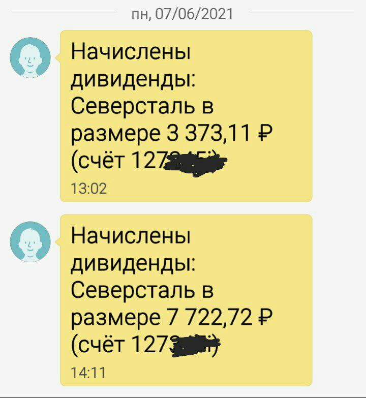 Дивиденды Северстали поступили на счет в Открытие брокер (2020г и 1кв 2021г). Не устану повторять как я люблю сталеваров (ну и разумеется такие вот смс). Северсталь была первым из металлургов, по которым я начал формировать позицию в пенсионном портфеле. Хотя сейчас имею помимо нее еще ММК и НЛМК, в принципе, глобально пока ничего не поменялось. Северсталь, на мой взгляд, является лидером стальной тройки. Когда только начинал формировать позицию, практически сразу получил просадку. Аналитики тогда тут же начали расказывать басни про цикличность сектора. Но я сидел и не рыпался. Что случилось дальше - вы знаете. Сейчас у меня в портфеле Северсталь висит с бумажной прибылью 73,5%. (это я её еще по маленьку докупал, повышая среднюю). Понятно, что ажиотажный спекулятивный спрос пройдет и котировки припадут. Но когда компания в любой ситуации ежеквартально честно платит дивиденды - это внушает доверие и оптимизм.