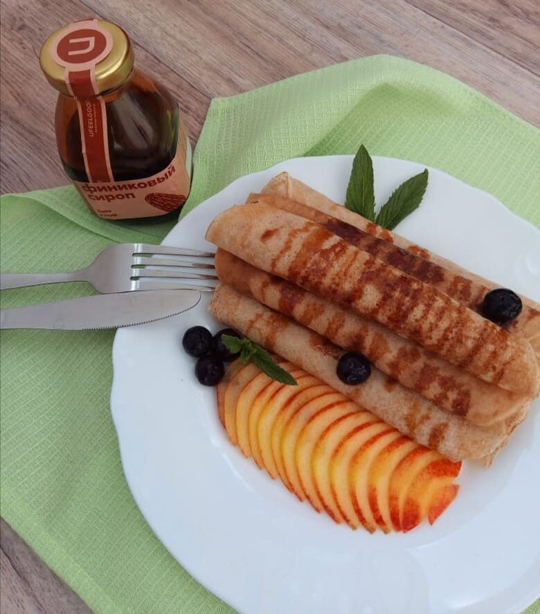 Такие блинчики можно хоть с фруктами хоть с сиропом. У меня финиковый сироп