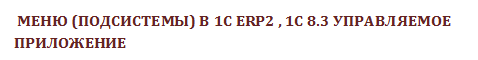 КАК СОЗДАТЬ СВОЙ ПУНКТ МЕНЮ (ПОДСИСТЕМУ) Для создания меню (подсистемы) в 1С ERP2 , 1С 8.3 управляемое приложение существуют объекты конфигурации Подсистемы. 1. Конфигуратор-->Общие-->Подсистемы Подсистмы первого уровня образовывают Панель разделов , подсистемы второго уровня,подчиненные подсистемам первого уровня, образовывают группы Панели навигации. Добавим в командный интерфейс новую подсистему (пункт меню) с именем “ МояПодсистема” Закладка Основные : Для видимости созданной подсистемы пользователями надо обязательно поставить галочку “Включать в командный интерфейс ”. Для каждого пункта меню можно создать свое подменю, подчиненное этой подсистеме. Для этого надо выделить свою подсистему ,правой кнопкой мыши вызвать контекстное меню В контекстном меню выбрать пункт Добавить-->ПодчиненнаяПодсистема. КАК НАСТРОИТЬ СОСТАВ ОБЪЕКТОВ ПОДСИСТЕМЫ Закладка “ Состав ”- Выбор объектов,которые мы хотим видеть в в нашем пункте меню , с помощью галочки (Справочники,документы и т.д.) КАК НАСТР