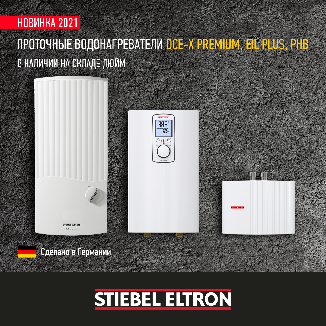 Дорогие друзья, с началом сезона отключения горячей воды, мы расширили для Вас ассортимент водонагревательной техники. Теперь на складе доступны новые модели проточных водонагревателей Stiebel Eltron. Флагманская модель DCE-X Premium - водонагреватель с электронным управлением и технологией 4i. DCE-X Premium автоматически изменяет проток для подачи горячей воды заданной температуры с точностью 0,5 С. ЖК-дисплей на лицевой панели обеспечивает удобство управления. Если Вам нужно компактное решения для горячей воды, отлично подойдёт модель EIL Plus. Водонагреватель устанавливается под раковиной. Доступен выбор из 4 вариантов мощностей: 3,2 кВт, 4 кВт, 5,2 кВт, 6,5 кВт. Спиральный нагревательный элемент обеспечивает работу даже с "жёсткой" водой. В ситуации когда требуется большая мощность, выручит модель HDB-E. Диапазон мощностей которой от 9,7 до 21,7 кВт. Прибор автоматически меняет мощность на основе температуры холодной воды и фактического расхода. В HDB-E реализована встроенная двойн