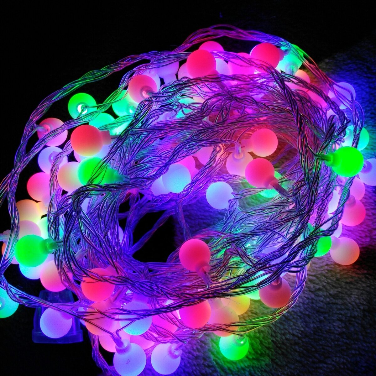 Друзья, делюсь очередной покупкой с алиэкспресс. На этот раз я приобрела гирлянды. Не одну, а несколько. Об остальных напишу и поделюсь ссылками чуть позже. Чем понравилась именно эта: во-первых красивая, во-вторых, очень приятная для глаз из-за того что диоды моргают не на прямую, а через шарики-рассеиватели света. Приклеены они на диоды с помощью термоклея. На гирлянде 4 цвета шариков: желто-оранжевый, красный, синий и зеленый.