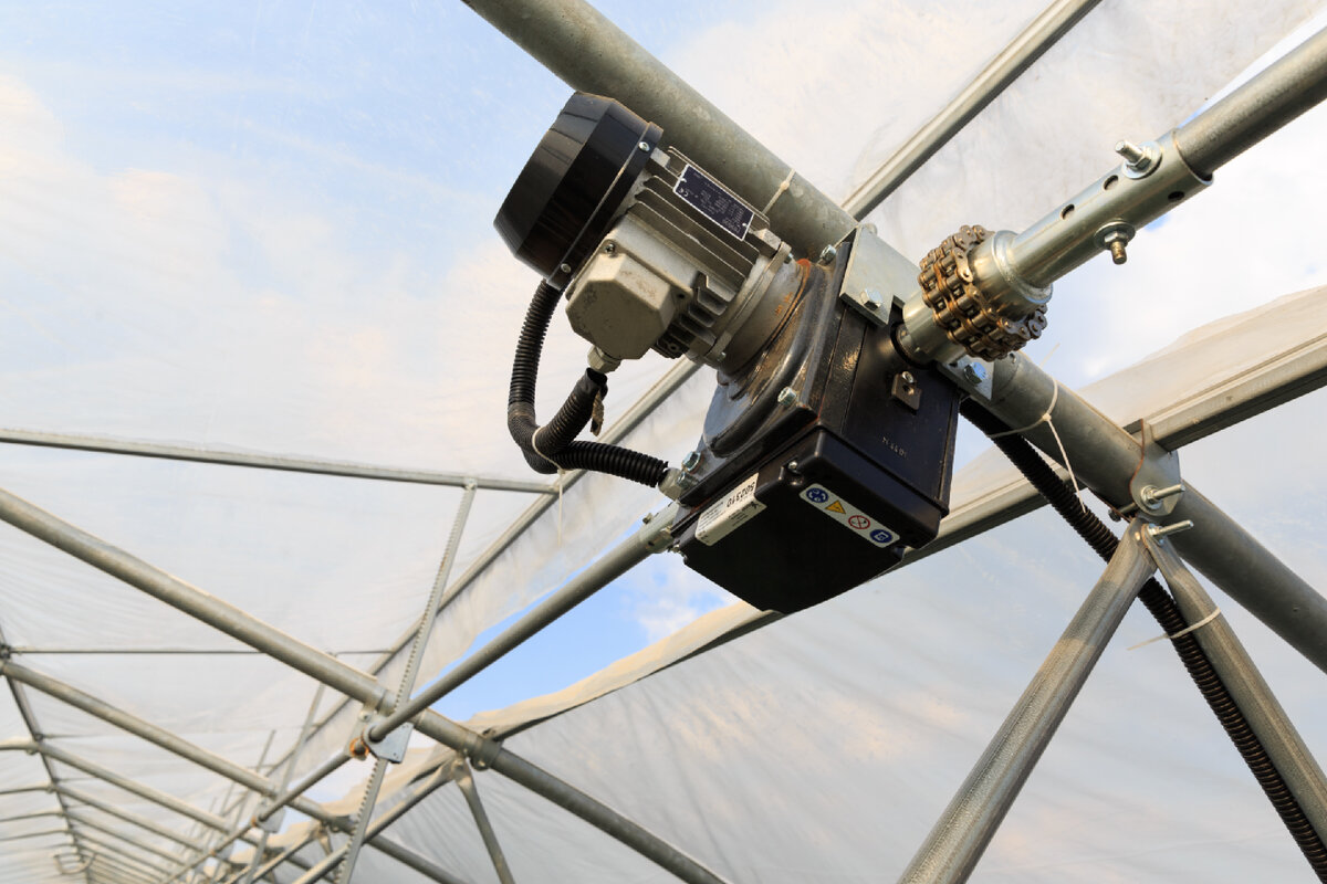 Для поддержания микроклимата в теплице необходимо устройство вентиляции, наибольшее значение имеет коньковая форточка. Ее устройство наиболее сложное, т.к. как правило форточка имеет большой вес, большую парусность в открытом состоянии, необходима герметичность при закрытии. Испытанным решением является использования электрического мотор- редуктора, в отдельных случаях ручного редуктора, зубчатых реек прямого или сабельного (для большего радиуса открытия и экономии места в закрытом состоянии) вида Пример устройства форточки. Детали коньковой форточки и описание их крепления. 1. Мотор-редуктор. Мотор редуктор устанавливается в середине теплицы (на среднюю арку), при помощи крепежной пластины, хомутов и болтов М8х50 (в комплекте). Мотор-редуктор крепится за арку при этом двигатель должен находится ниже редуктора по арке. Рейка -ридер На "поперечной" форточке навариваются "уши" для крепления рейки "Ридер", так же рейка может крепиться через ограничитель зубчатой передачи. Крепление рейк