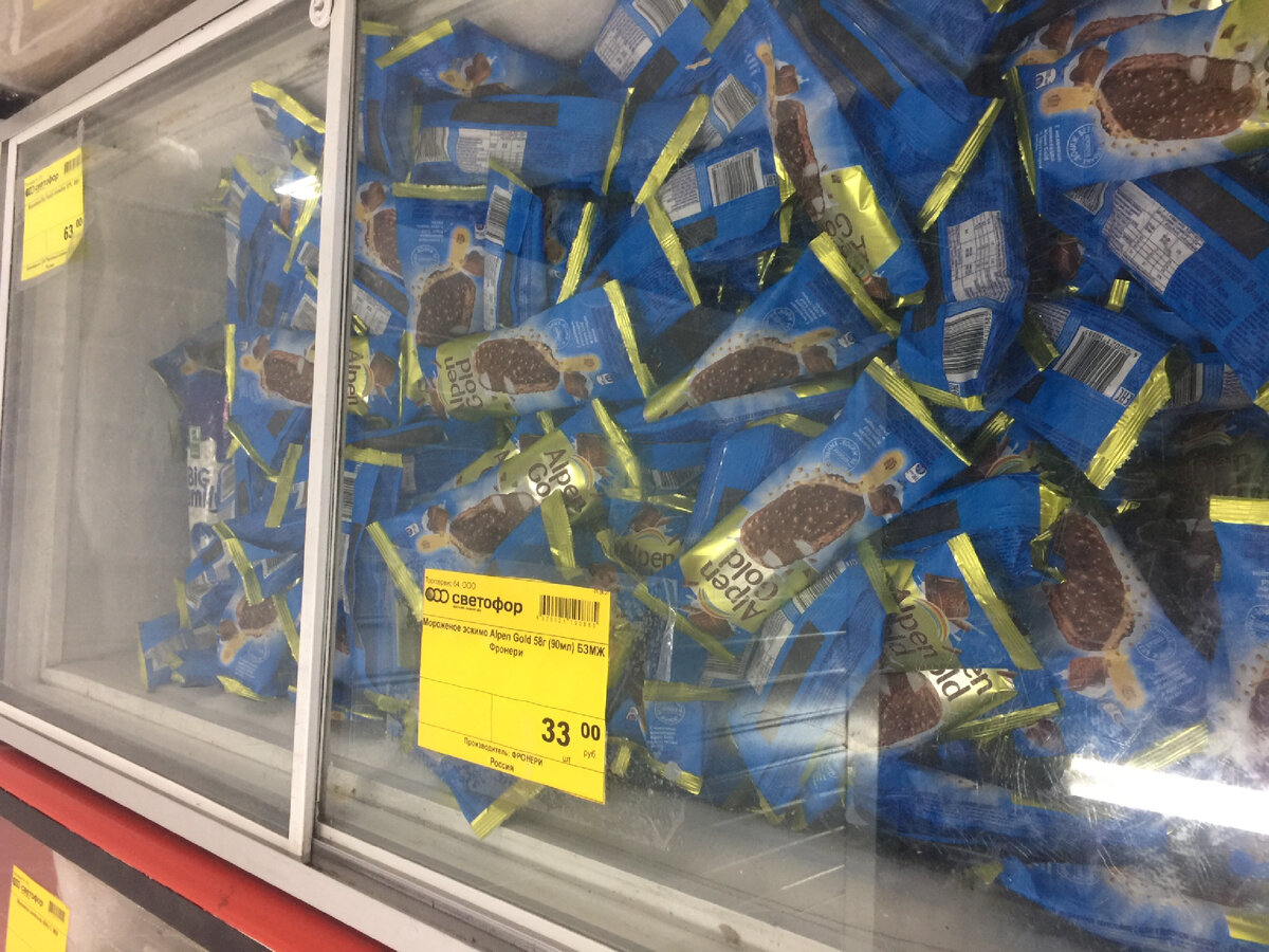 В основном в светофоре самые дешёвые продукты и соответственно составы не очень. Комментаторы постоянно пишут, что это свалка и помойка, и ничего тут не покупать. В прошлых обзорах, я уже рассказывала об этом, например об обколотой курице. Но тут есть и хорошие продукты! Смотрите сами : Мороженое эскимо Alpen Gold - 33₽, подобное стоит в два раза больше. Она невероятно вкусное, с орешками, классным шоколадом. Попробовали и пожалели, что не взяли десяток про запас. Так же рядом Варя - 400 гр. - 58.70 р. тоже отвал башки, а не мороженое. Цена снова ниже. Всеми известные приправы - 3 шт.- 82₽, Всего по 27 р, упаковка в супермаркетах у дома намного дороже. Средство для посуды AOS - 1л., - 69.90₽. Такими средствами моют посуду большинство. Цена большой бутылки около 130₽ - 150₽ Фэйри тоже литр - 71.00₽ . Это товары массового потребления и они почти в каждом доме. Обратите внимание такую цену больше никто не предлагает. Sorti - 400гр - 19₽, такая же история. Халява. Мыло DURU - 45