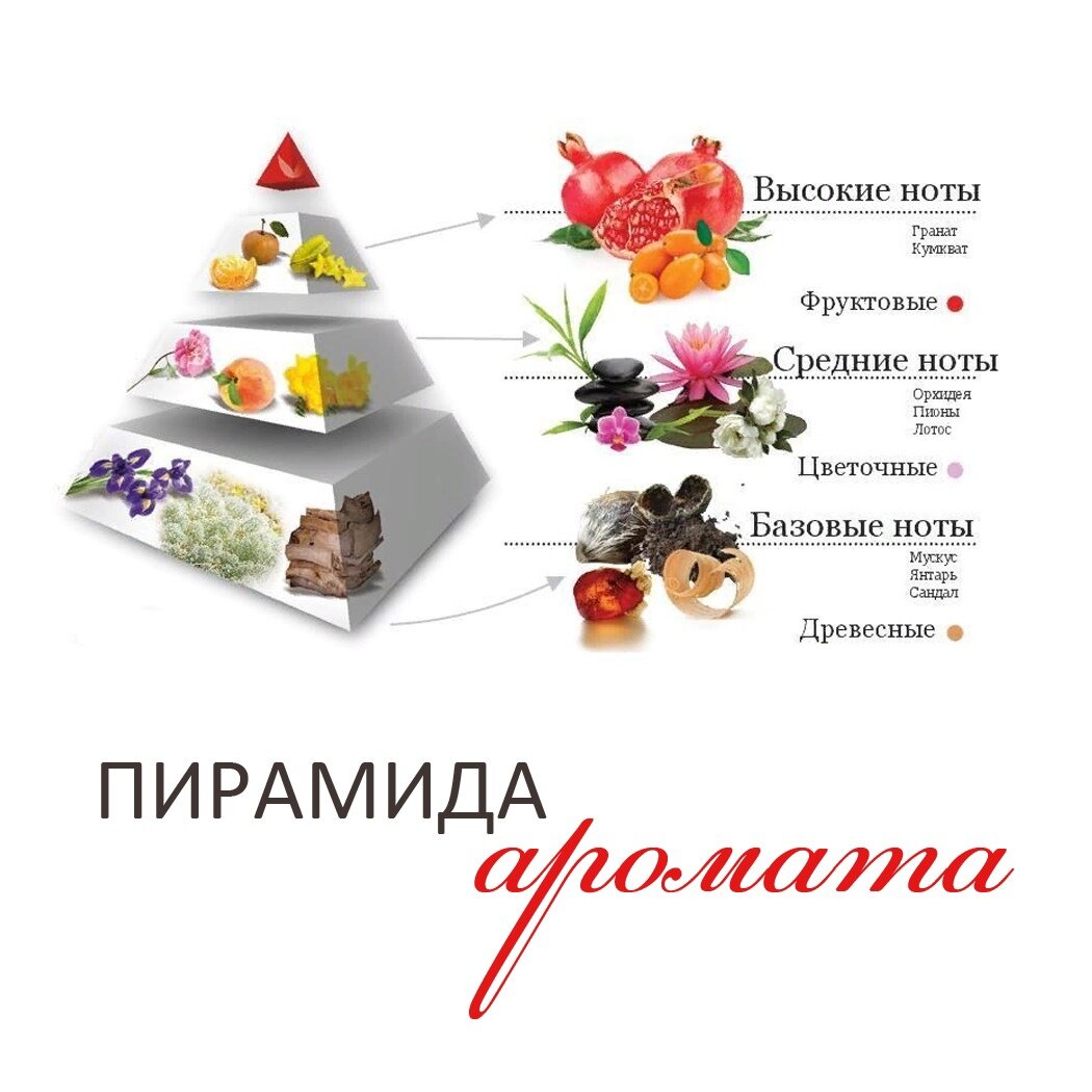 ПИРАМИДА аромата или ольфакторная пирамида - это постепенное раскрытие аромата. Обычно в аромате выделяют три ноты: