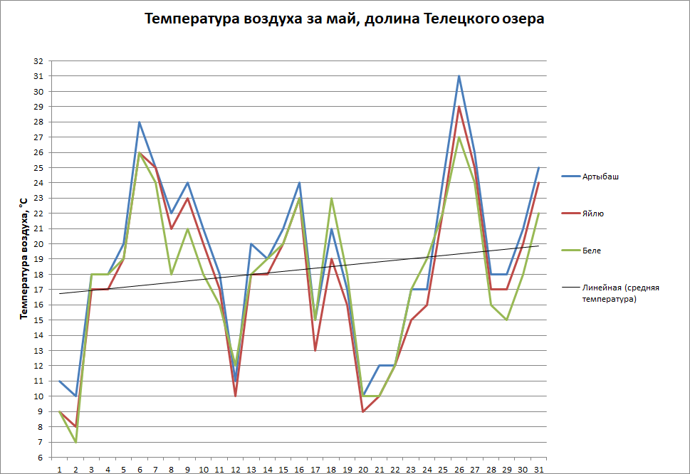 Среднемесячная температура воздуха за май составила 18,3°С, что на 7,6°С выше апреля. По вечерам в воздухе еще ощущается прохлада от Телецкого озера. Практически все майские дни были окутаны в серую пелену плотных облаков. В середине месяца выпадал снег, после которого температура воздуха опускалась до 0°С. Дважды за месяц поднимался уровень воды в озере и реках. Продолжают оживать насекомые. Отмечена встреча первого майского жука и паута. Гудят шмели и пчелы. Отгремела весенняя пора первоцветов. Отцвели кандыки, ветреницы, хохлатки. На смену им раскрылись ог