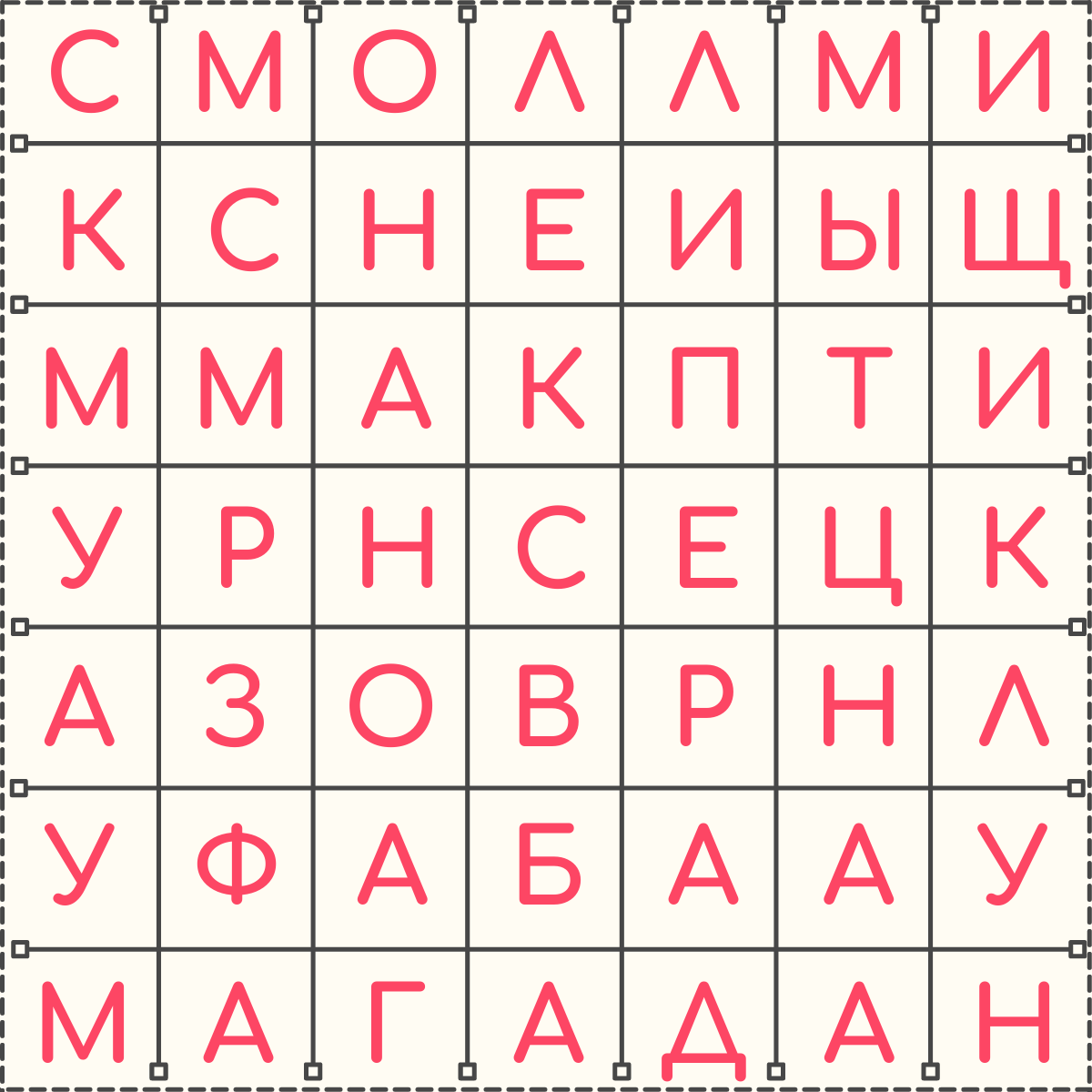 Привет всем! Предлагаю вам пройти тест на внимательность. На картинке спрятаны названия восьми городов. У меня не получилось найти все с первого раза. Слова изгибаются под прямым углом, можно смотреть по горизонтали и по вертикали. Задание Ответ Пишите Ваши ответы в комментариях, будем сверяться. Не забывайте подписываться на канал и ставить лайки.