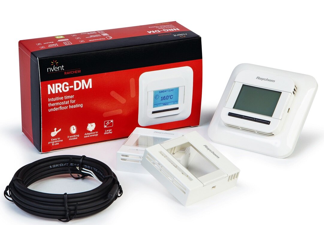 Один из наших любимых продуктов – это терморегулятор nVent RAYCHEM NRG-DM. И сейчас мы расскажем вам, почему. NRG-DM – это простой в эксплуатации, программируемый терморегулятор, который подходит для установки как в рамки других производителей (например, рамки серии Exxact от Schneider), так и для самостоятельной установки в "родной" рамке. Но располагать его следует вне влажного помещения, потому что его класс защиты IP21. Интуитивно понятный терморегулятор NRG-DM легко использовать и настраивать. Он имеет 3 режима работы: режим постоянной работы, пользовательский режим, «турбо»-режим (то есть режим повышенной мощности для быстрого нагрева). Это очень умный терморегулятор, ведь именно с ним Вы можете получить желаемую температуру к нужному Вам времени времени: например, ко времени пробуждения первого члена семьи или ко времени возвращения с работы. И всё это благодаря специальной адаптивной функции. Что же делает интеллектуальная и точная адаптивная функция у терморегулятора NRG-DM: