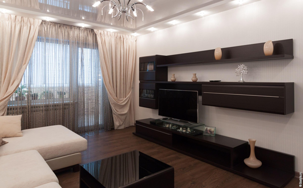 Мебель для гостиной предполагает наличие гарнитура, размер и вместительность которого зависит от того, как он будет использоваться. Если нужно организовать места хранения одежды и спальных принадлежностей, то шкафы могут занимать одну из стен комнаты. Но в гарнитуре должна быть ниша для установки обязательного атрибута гостиной – телевизора.