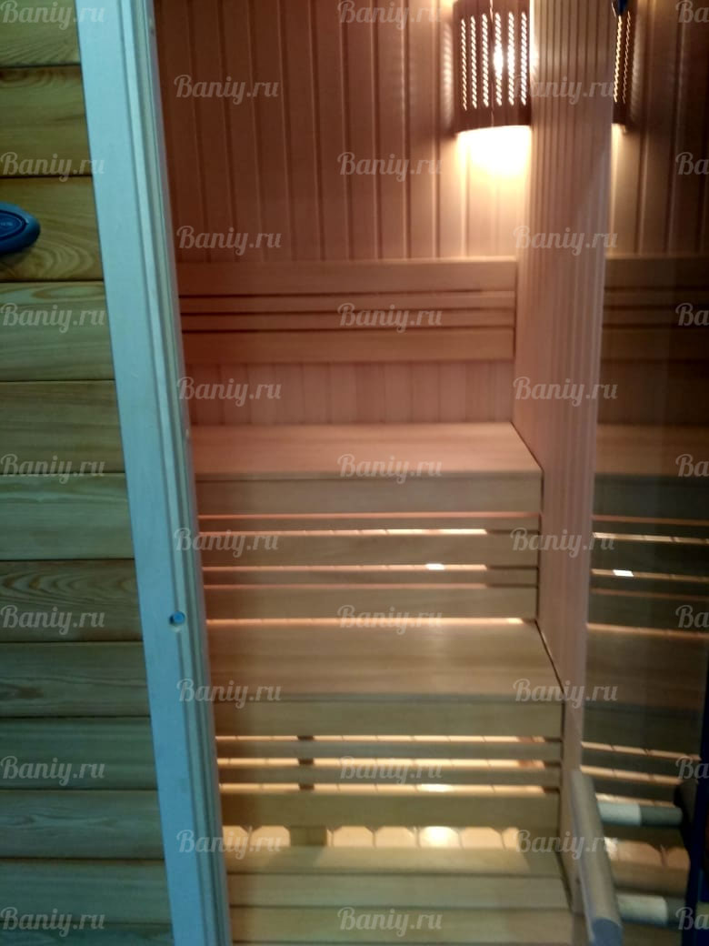 Была выполнена отделка финской сауны в Серпухове. Стены и потолок отделаны вагонкой из липы. Полоки сделаны мз африканского дерева Абаш. Установлена электрическая печь HARVIA, встроенная в полок. Наружная зашивка обита вагонкой из лиственницы. Установлена стеклянная дверь, Дизайн стекло. Абажуры для освещения сделаны из липы.
