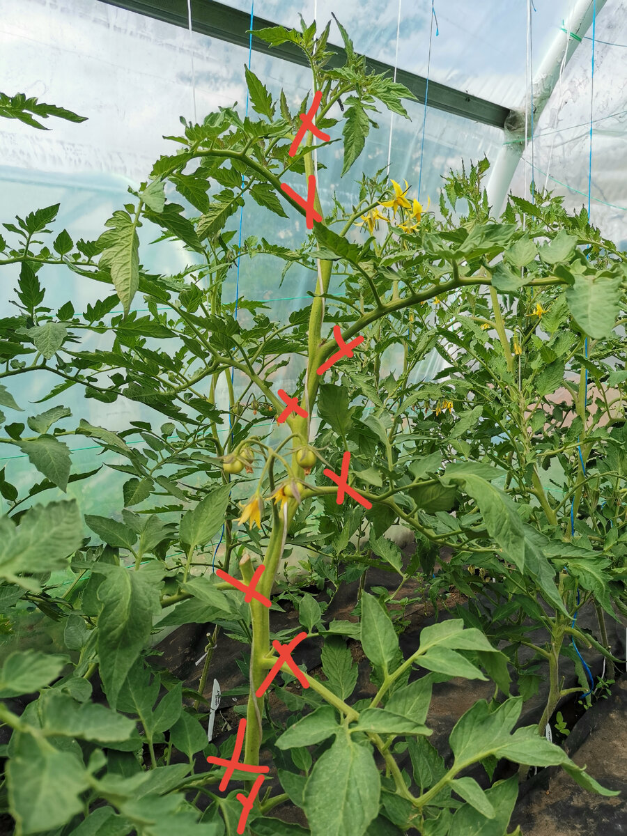 Тут тоже нет ничего сложного. Такой вариант подойдёт для томатов с плодами от 250 до 500 г. Или если вам так удобно вести высокорослый томат. Обычно так все их и формируют.
