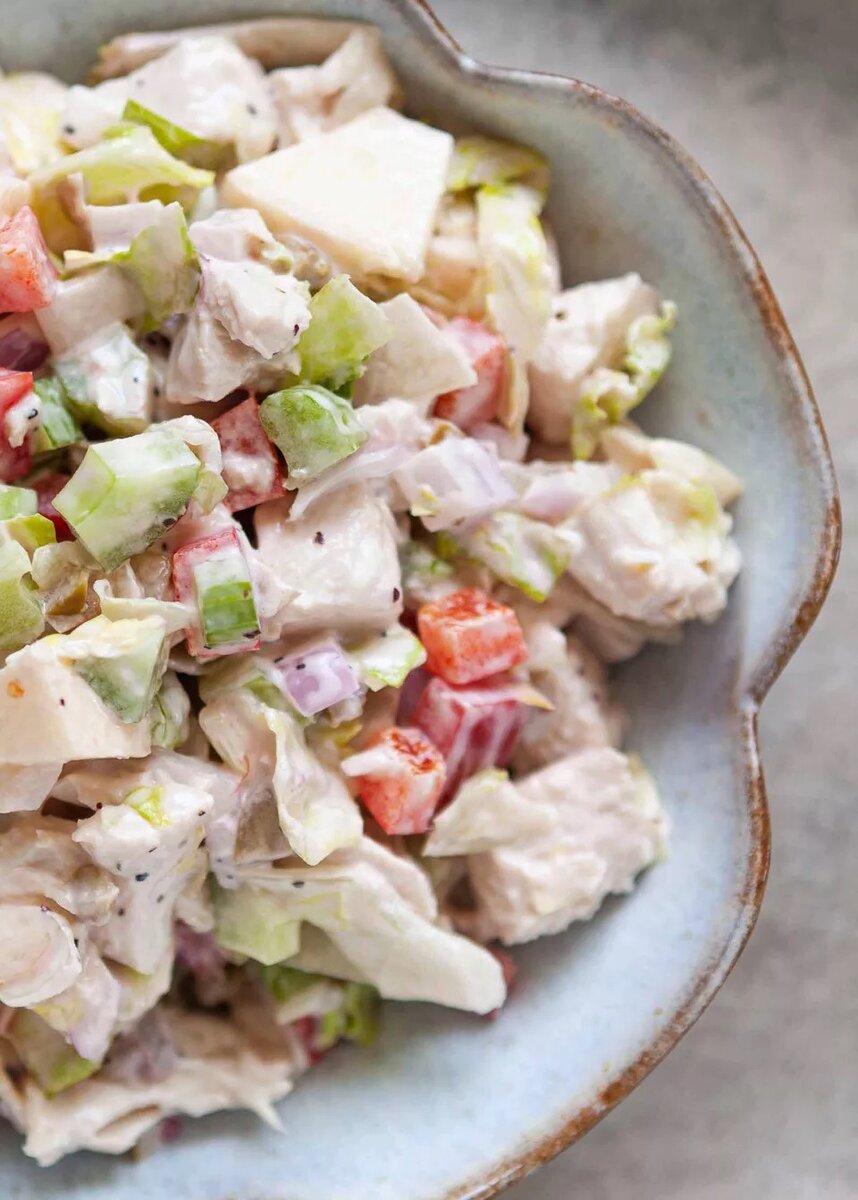 Этот любимый семейный салат из курицы готовится с сельдереем, болгарским перцем, зелеными оливками, яблоком, листьями салата и майонезом—плюс секретный ингредиент, который имеет все значение! Это не совсем стандартный куриный салат. В рецепт входит нарезанное яблоко для сладкой ноты, а также нарезанные зеленые оливки для их острой солености. Что Делает Этот Куриный Салат Особенным "Секретный соус", так сказать, этого куриного салата-это столовая ложка сливового варенья, которое моя мама добавляет в заправку на основе майонеза. Вы можете использовать любое ягодное желе или варенье, но так как у нас всегда есть много сливового варенья под рукой (благодаря нескольким сливовым деревьям), это то, что мама достает в первую очередь. Мама уравновешивает сладость от капельки джема небольшим количеством лимонного сока. Каков результат? Замечательно! Как приготовить курицу для Куриного салата Что мне нравится делать, так это ставить кастрюлю с 2 литрами воды и 1 столовой ложкой соли на кипение. П