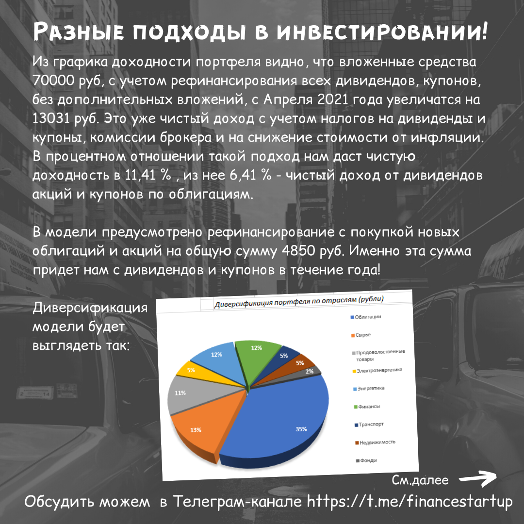 Друзья , всем привет ! В одном из своих постов я писал , как сохранить свои сбережения и еще получить достаточную прибавку к накоплениям за счет фондового рынка. Рассказываю на примере двух портфелей , которые сейчас актуальны в моей семье. 1. Вложения единоразовые - 70000 руб. с рефинансированием доходов. Ежемесячных взносов нет ! 2. Вложения ежемесячные на минимальную установленную "за правило" сумму, также с рефинансированием всех доходов. Рассмотрим оба. Картинки выше Из графика доходности по первому портфелю видно, что вложенные средства 70000 руб, с учетом рефинансирования всех дивидендов, купонов, без дополнительных вложений, с Апреля 2021 года увеличатся на 13031 руб. Это чистый доход с учетом налогов на дивиденды и купоны, комиссии брокера и на снижение стоимости от инфляции. В процентном отношении такой подход нам даст чистую доходность в 11,41 % , из нее 6,41 % - чистый доход от дивидендов акций и купонов по облигациям. В модели первого портфеля предусмотрено рефинанси
