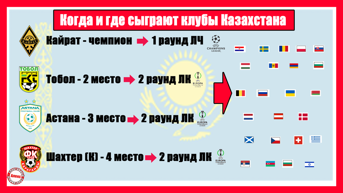 Здравствуйте, уважаемые любители казахстанского футбола. В еврокубках сезона 2021/2022 года выступят 4 команды. Чемпионом стал Кайрат. Второе место в таблице занял Тобол Столичная Астана неожиданно стало в прошедшем сезоне только третьей И четвертое место было у Шахтера из Караганды. Давайте вспомним, что прошлый сезон был провален. Казахстан стал 51-м среди 55 стран УЕФА. Кайрат принес в таблицу коэффициентов 2 очка. Астана – 1. Ордабасы и Кайсар - по 0,5 очка. Эти 4 набранных очка делим на 4 клуба и получаем 1 балл в прошлом сезоне. Это и есть 51-е место. Итак, вернемся к новому розыгрышу. Чемпион Кайрат стартует в первом раунде квалификации Лиги Чемпионов. Жеребьевка этого этапа состоится 15 июня, а матчи пройдут в следующем месяце: 6-7 и 13-14 июля 2021 года. Проще говоря, Кайрату, чтобы попасть в группу, необходимо пройти 4-х соперников. Отметим, что потенциальными оппонентами по первому раунду отбора могут стать и загребское Динамо, шведский Мальмё, румынский Клуж, польская Легия