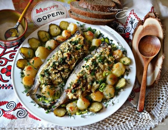 Надо хорошо почистить рыбу, удалить жабры и помыть. Над псалиииить, поперчиииить 😁 и наршарабом натереть. Убрать в холодильник на час минимум. Измельчить чернослив, грецкие орехи и лук. Начинить рыбу и зашить брюхо. Можно на рыбе сделать надрезы небольшие.