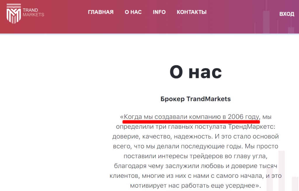 На странице "О себе" мошенники пишут, что создали компанию в 2006 году. Далее рассказывают нам басни о доверии тысяч клиентов, которые сотрудничают с ними на протяжении многих лет. Только все это наглая ложь и вранье. Ни на одной странице сайта markettrands.com нет ни слова правды. И мы вам это докажем.