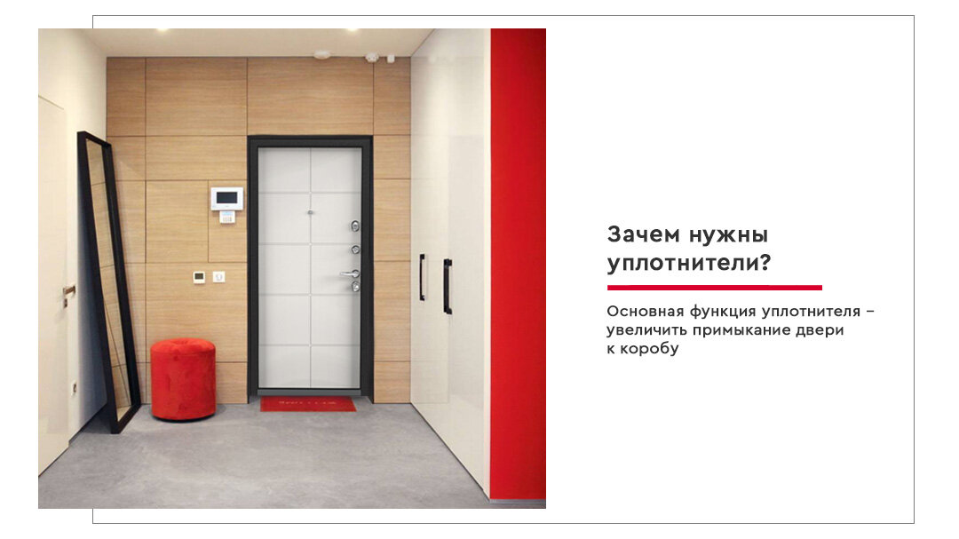 Основная функция уплотнителя – увеличить примыкание двери к коробу. Это делает конструкцию герметичной и избавляет от сквозняков и неприятных запахов с лестничной площадки. Если ваша дверь ведет сразу в квартиру, на уплотнители стоит обратить особое внимание.