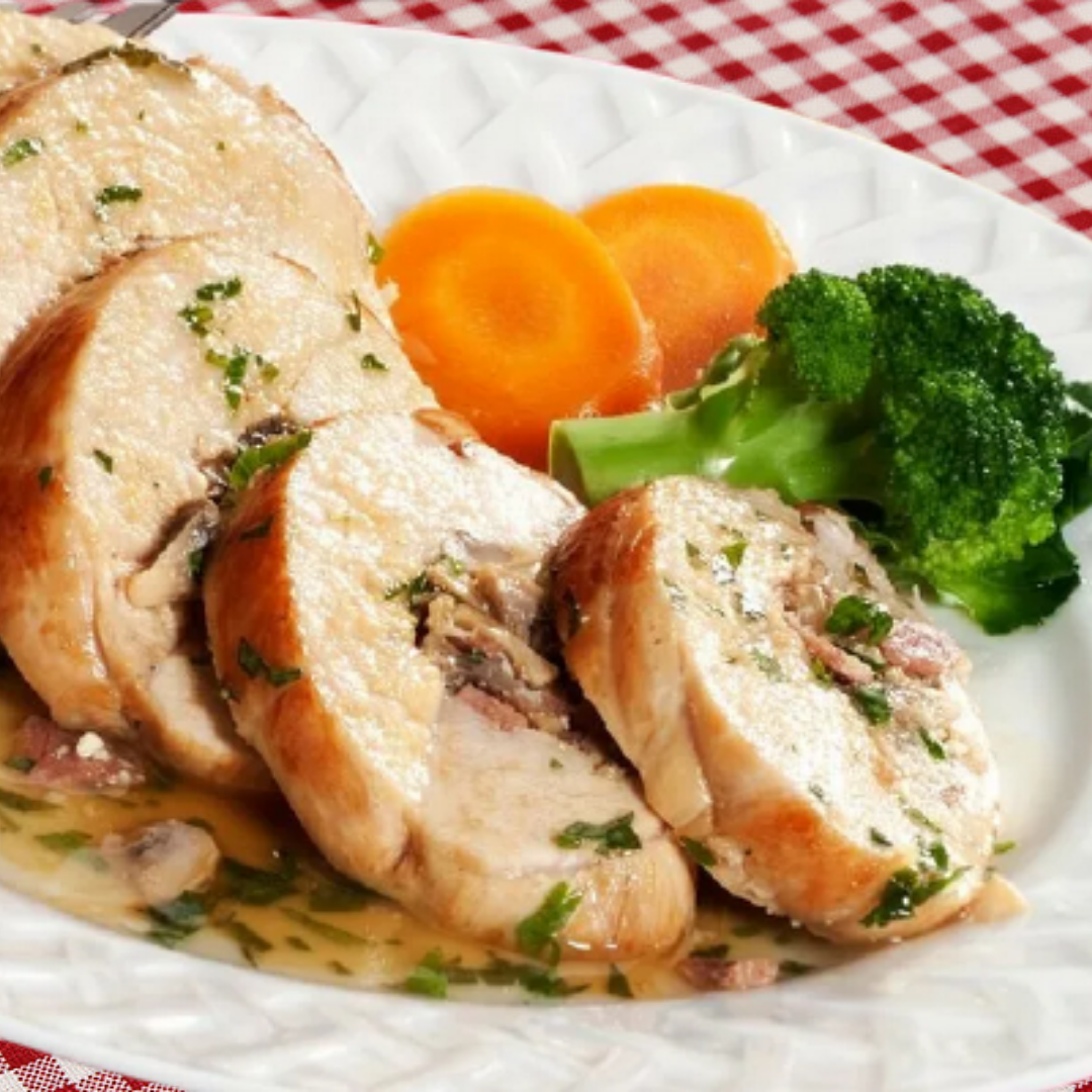 Ингредиенты : Куриная грудка - 1 шт Яйцо - 1 шт Шампиньоны - 4-5 шт Сыр - 100гр Зелень - пучок петрушки, укропа или кинзы (по вашему выбору) Чеснок - 1 зубчик Соль, перец, специи - по вкусу Масло растительное. 👉 Приготовление: Подготовить фольгу, смазать ее маслом и специями с измельченным чесноком. Надрезать половину грудки вдоль, расправить и хорошо отбить. Выложить отбитую грудку на фольгу ровным квадратом или прямоугольником. 👉 Делаем начинку : Взбить яйцо, соединить с натёртым сыром и мелко порезанной зеленью, грибами, солью и специями. 👉 Выложить начинку на куриную грудку, разровнять. С помощью фольги аккуратно свернуть плотный рулет и проткнуть несколько дырочек, для выхода пара. Выпекать в духовке 40 мин. при 180 градусах. За 10-15 минут до готовности раскрыть рулет, для румяной корочки. Приятного аппетита!