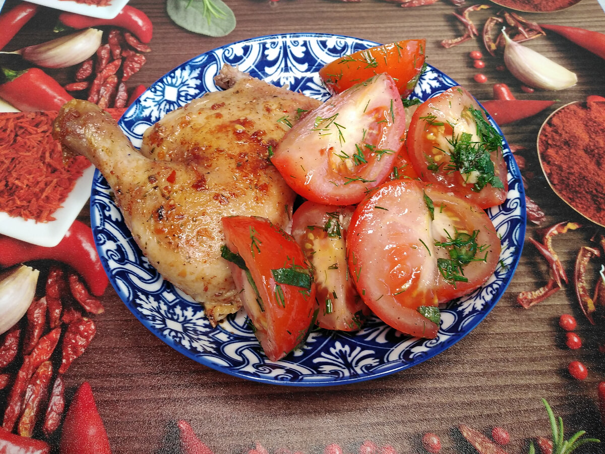 Помидоры берите среднего размера. Если ваши помидоры меньше или больше по размеру, то вы можете увеличить или уменьшить их количество соответственно. Если вы не любите вкус оливкового масла, то можете заменить его ароматным подсолнечным маслом. Не забудьте перед началом приготовления тщательным образом вымыть помидоры, чеснок и зелень. Нарежьте помидоры на четвертинки. Переложите нарезанные помидоры в большой салатник или миску для смешивания. У укропа удалите жесткие стебли, а веточки мелко измельчите. У мяты оборвите листочки. Стебли мяты нам не понадобятся. Мелко измельчите листочки мяты. Зубчики чеснока можете пропустить через измельчитель, нарезать ножом или воспользоваться (как и я) мелкой теркой. Половинку небольшого стручка острого перца нарежьте тоненькими кружочками. Все переложите в салатник или миску для смешивания к помидорам. В миску для смешивания или салатник добавьте сахар, соль и черный молотый перец. Заправьте салат маслом и аккуратно перемешайте. Наш летний салат из
