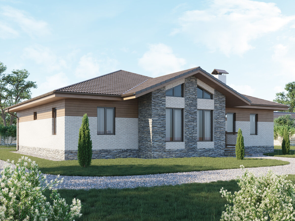 Дом из газобетона "Лестер" 163 м2 / 1 этаж / 3 спальни 4 630 000 руб Стоимость дома указана в комплектации "теплый контур". В комплектацию входит: 1. Фундамент - ростверк свайно-ленточный ж/б 2. Несущие стены внутри и снаружи из газобетонных блоков 300 мм, внутренние перегородки 1 этажа - газобетонный блок 100мм, 2 этажа - деревянный каркас 3. Кровля с финишных покрытием - металлочерепицей 0.5 мм, утеплением 200 мм, монтажем крюков водосточной системы 4. Устройство ж/б армопояса по проекту, монтаж ж/б перемычек в оконных и дверных проемах 5. Монтаж окон ПВХ - четырехкамерные энергосберегающие стеклопакеты 6. Дверь входная металлическая