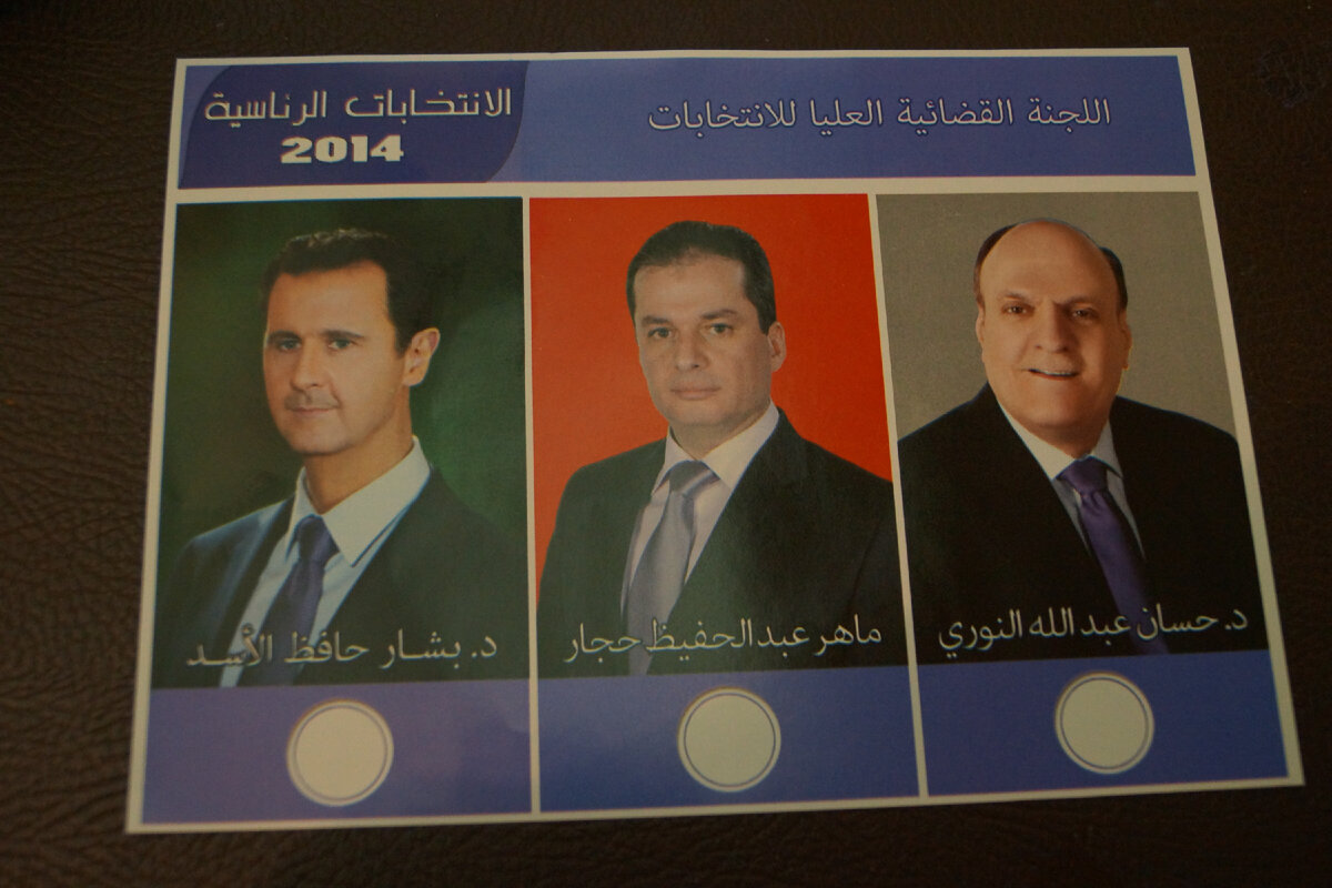 Собственно, никаких сомнений в его победе ни у кого и не было. Ночью, когда были обнародованы результаты, в Сирии палили радостно из автоматов в воздух (в прошлый раз сам Башар просил этого не делать, но снова не слушались), наверное, опять кого-то зацепило шальными пулями, люди от этого постоянно гибнут. Я сама несколько раз была под таким огнем, не знаю уж, каким чудом не зацепило. Сегодня, как и обещала, я покажу, как выглядят президентские выборы в Сирии. Это я снимала на прошлых выборах, ФОТО АРХИВНЫЕ, не этого года. Бюллетень тогда, к примеру, выглядел вот так: У третьего кандидата (он бизнесмен и занял второе место на выборах, поэтому побыл какое-то время министром) я перед выборами брала интервью. Умный дядька. А третий был какой-то дерганный дядька от, кажется, Компартии. С ним поговорить у меня лично времени не хватило. Мы с двумя коллегами предприняли марш-бросок по сразу четырем городам. Для пущей объективности и полноты картины. Утром были в Дамаске. Днем в Хомсе. Веч