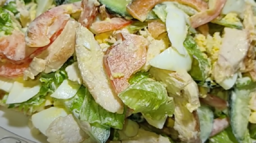 Салат Витаминчики Легкий весенний салат из доступных продуктов.Это прежде всего польза для вашего здоровья и поможет вам быть в отличной форме Нам понадобятся продукты: 4 отварных куриных яйца, 1 огурец, 500 г.куриной грудки, 1 красный болгарский перец, 4 листа зеленого салата, 1 ст.л.растительного масла, 2 ст.л.майонеза, соль и смесь перцев по вкусу, 1 ст.л.нашинкованного мелко укропа, 1 ст.л.лимонного сока, Этот простой салат поможет вам поддержать свой организм во время весеннего периода и быть всегда в прекрасном настроении. Приготовление: Куриную грудку разрезаем вдоль на 2 одинаковых пласта, солим, перчим. Ставим сковороду на огонь, разогреваем в ней растительное масло и обжариваем их на сковороде с обеих сторон до готовности, переворачивая деревянной лопаткой. Затем снимаем с огня, остужаем и нарезаем ножом на доске, крупной соломкой и отправляем в миску. Яйца нарезаем ножом на доске крупными дольками и так же кладем к куриному мясу. Огурец промываем разрезаем на дв