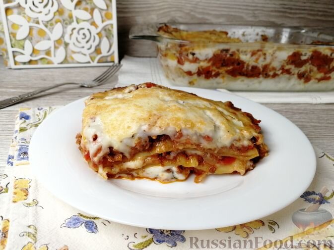 Приготовление домашней лазаньи с говяжьим фаршем, соусом бешамель и сыром займёт некоторое время, но результат того стоит. Мясной фарш обжаривается с овощами и тушится в томатном соусе с вином до полного слияния вкусов всех компонентов. Классический соус бешамель в этом рецепте призван пропитать и размягчить листы для лазаньи. Такое аппетитное и сочное блюдо станет достойным угощением для гостей или прекрасно разнообразит обыденное меню.