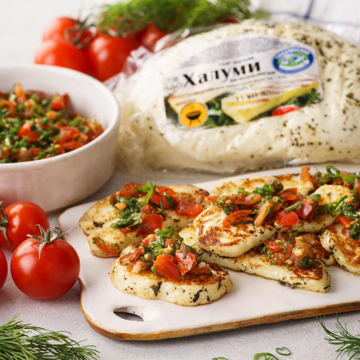 перец 1. Помидоры нарезать небольшими кусочками (помидоры черри можно разрезать на четыре части), зелень и лук мелко порубить по вкусу, халуми нарезать ломтями толщиной 1-1,5 см. 2. Смешать помидоры с зеленью и луком, посолить и поперчить по вкусу, добавить ложку оливкового масла и перемешать. 3. Сыр жарить непосредственно перед подачей. Прогреть сковороду с оливковым маслом, быстро выложить ломтики сыра в один