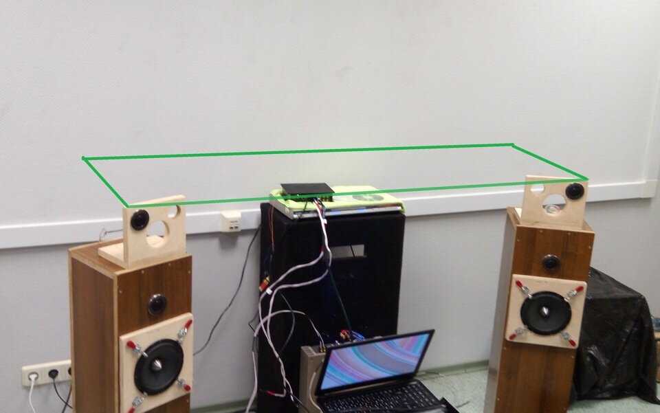Зеленым я разметил перпендикуляры от стены к твиттерам и проекцию горизонтали между твиттерами, чтобы было нагляднее. При нормлаьно настроенной системе даже плохие компоненты не дадут образам инструментов на сцене опускаться ниже этой плоскости. В самом плохом варианте, где не будет никакого эшелонирования, все инструменты выстроятся в горизонталь по переднему краю нарисованной на этой фотографии зеленой площадки. В трактах получше возможны варианты, с которыми предлагаю ознакомиться на конкретных примерах.