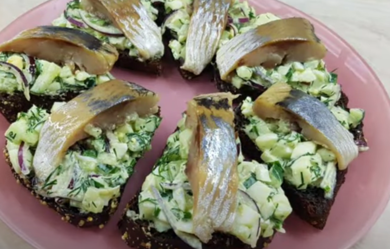 горчицу, все перемешиваем деревянной ложкой, начинка наша готова.Затем берем ломтик хлеба и сверху аккуратненько выкладываем наш салат, разравниваем по всему кусочку и украшаем ломтиком сельди.