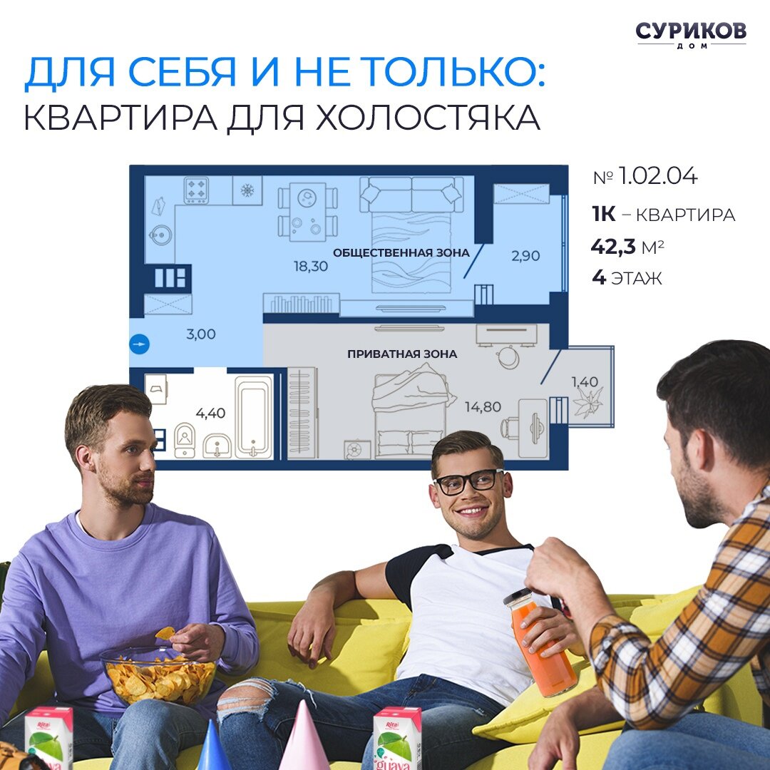 Что должно быть в такой квартире? Рабочее место — обязательно, особенно если учесть популярность «удалёнки». Место для игровой приставки и большого телевизора, где можно погонять мяч в FIFA — без этого никуда. Возможно, место для творческих увлечений: игре на электрогитаре или клавишных.