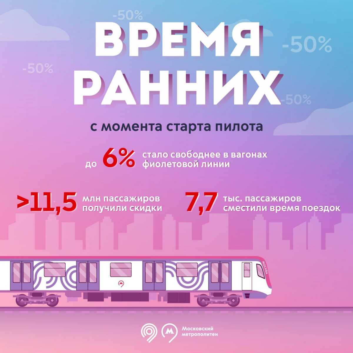 7,7 тысяч человек едут в другое время. На линии будто запустили ещё 5 поездов. Это результат проекта «Время ранних» и снижения стоимости на Казанском направлении ж/д. С 12 мая снизили цену поездок на Казанском направлении с 20 областных станций до Сортировочной, Электрозаводской и Казанского вокзала. Это помогает разгрузить станцию метро «Выхино» — многие переходили сюда с электричек. Теперь около 500 человек в час пик отказались от этой пересадки и едут по ж/д до метро «Комсомольская» или «Электрозаводская». С ноября поездка по Таганско-Краснопресненской и Некрасовской — в 2 раза дешевле в рабочие дни с открытия метро до 7:15 и с 8:45 до 9:15. Уже 7,7 тысяч человек перестали ехать в час пик, всего скидки получили свыше 11,5 млн пассажиров метро. Мы почти достигли цели по разгрузке вагонов Таганско-Краснопресненской линии в утренний час пик на 7%, — Максим Ликсутов.