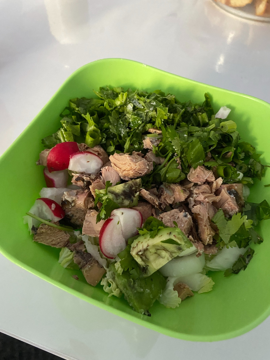 Это салат из овощей, зелени и тунца, заправлен оливковым маслом.