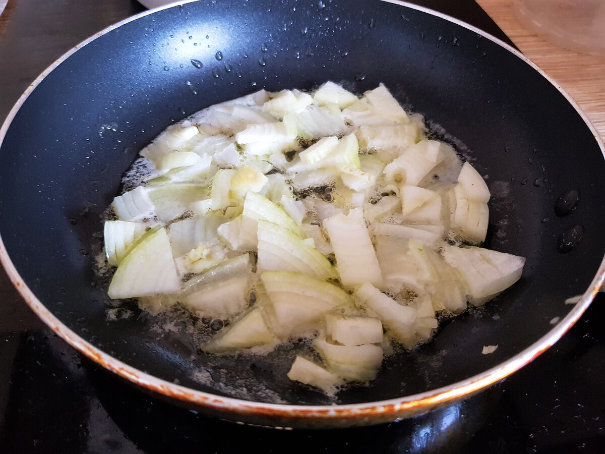 Эти тефтели готовятся на вытопленном животном жире. Говяжий жир нарезаем мелкими кубиками и вытапливаем на горячей сковороде, получившиеся шкварки убираем, а на растопленном жире обжариваем нарезанный лук до золотистого цвета. Затем добавляем к нему мелко нашинкованную морковку и тоже обжариваем.